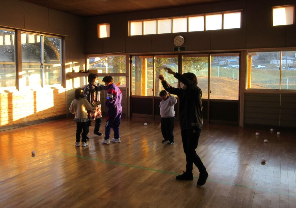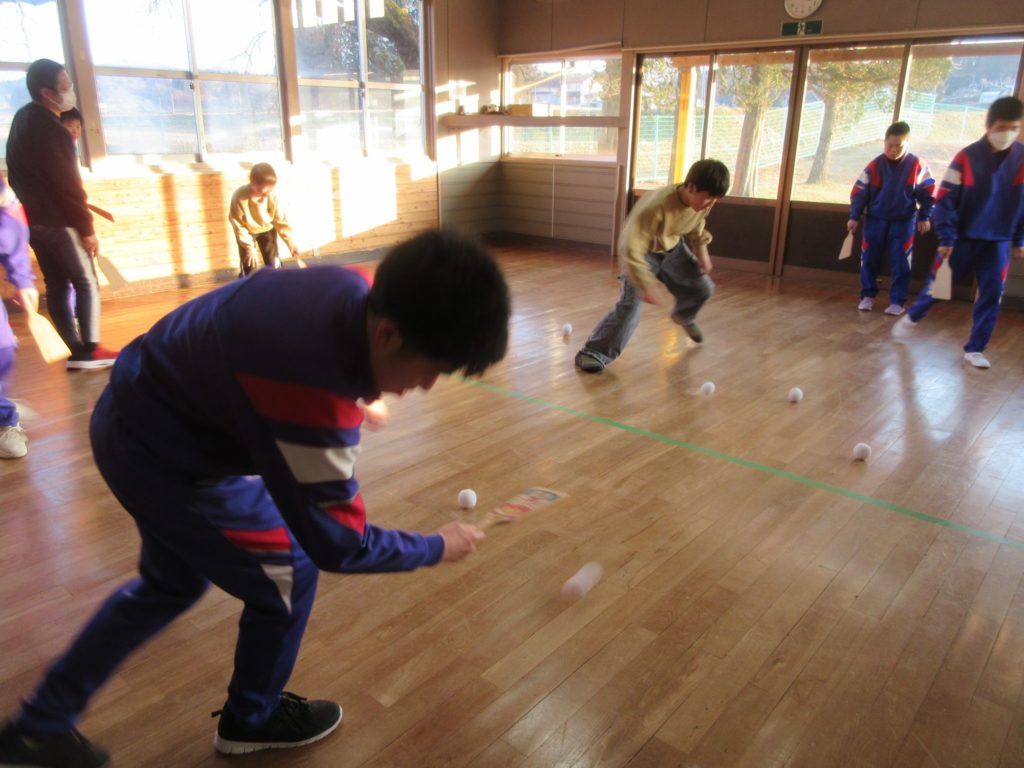 相手の陣地に羽子板で雪玉をたくさん入れたチームの勝ちです💪
