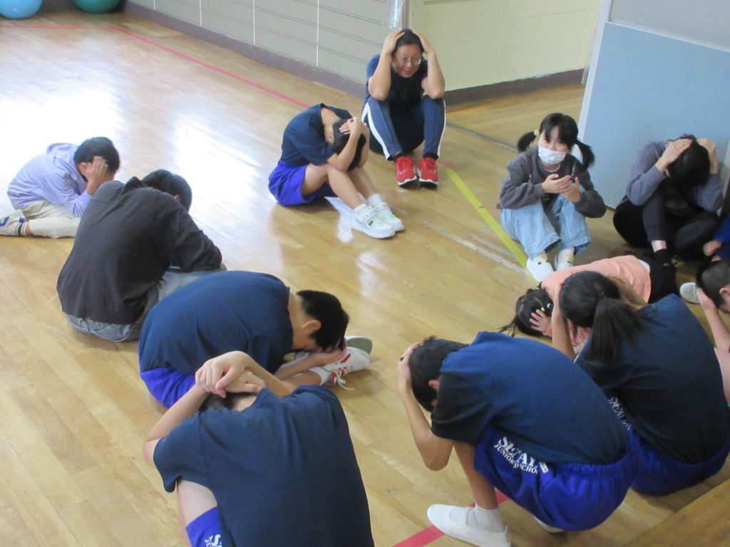 2025年10月1日(水) 避難訓練💪 今日は『避難訓練』をみんなでしました😎 地震が起きたらどうするか考えていこうね💡 大きな地震が起きると、緊急地震速報の音が鳴ります📣 そしたらまずは身の安全を守れるところに避難することが大切です❕ 教室だったら机の下に隠れるけど、机がないところだとどうする❓ ガラスがない壁際に移動して、頭を手で抱えることが大切です👍 廊下やホールで実践してみました👌 いつ何が起こるかわからないので、日ごろから訓練はしておきましょう🔥 みなさんおつかれさまでした😁
