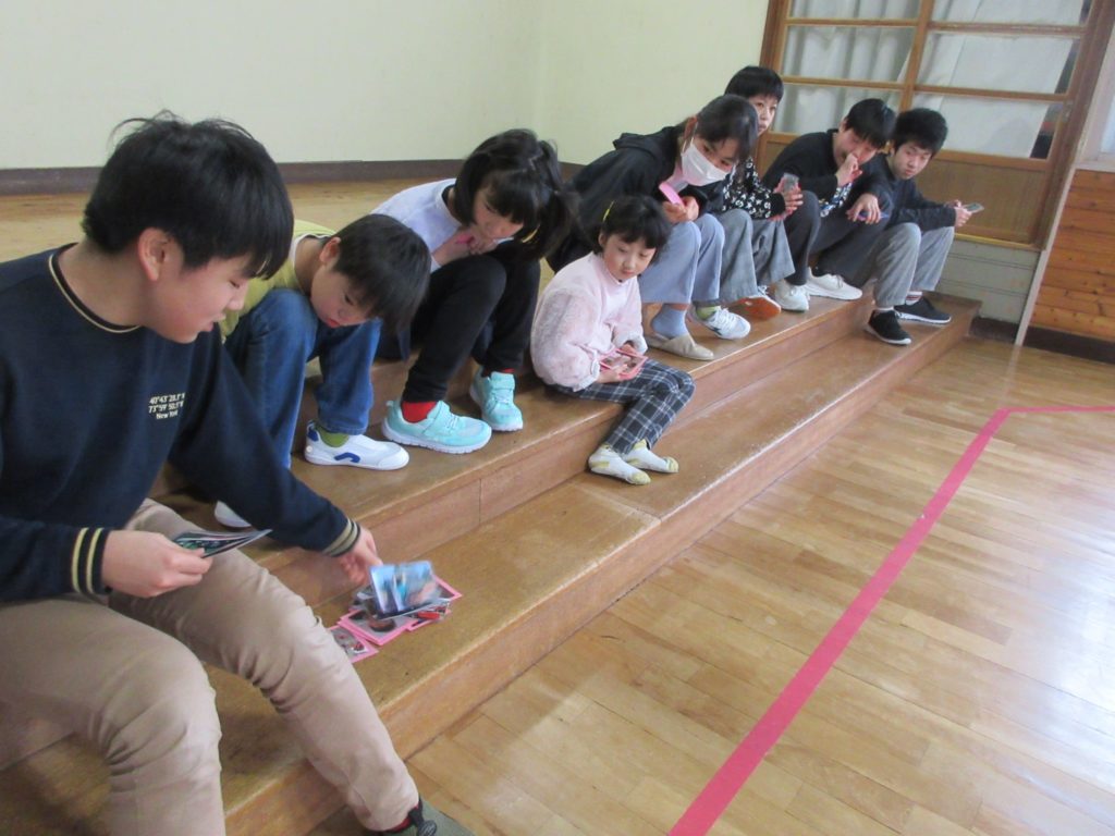 音楽に合わせてカルタの周りを歩いて、音楽が止まったらお題のカルタを取ります👀