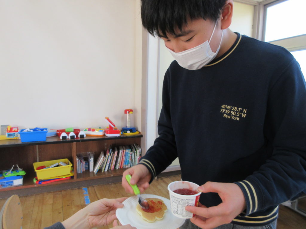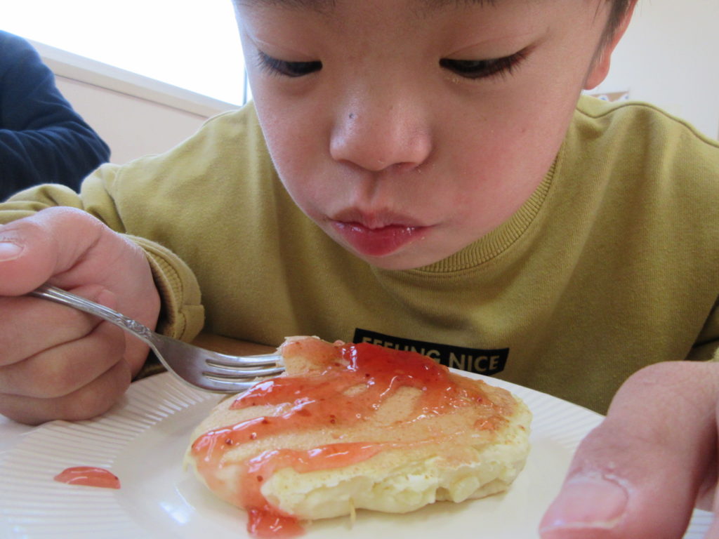 2026年3月13日(金) ホットケーキ😋 今日はおいしいおいしいホットケーキ作りをしました🥄✨ 牛乳とホットケーキミックスをジップロックにいれて、もみもみして混ぜます👍 その生地をホットプレートに流し込んで焼いていきますよ~😚 丸くなるように調整していきます⭐ 焼きあがったホットケーキには好きなシロップをかけます💞 チョコ、いちご、ケーキシロップ、あんこ👀 迷っちゃうね~😎おかわりもしてたっぷり食べた子どもたちなのでした🎶