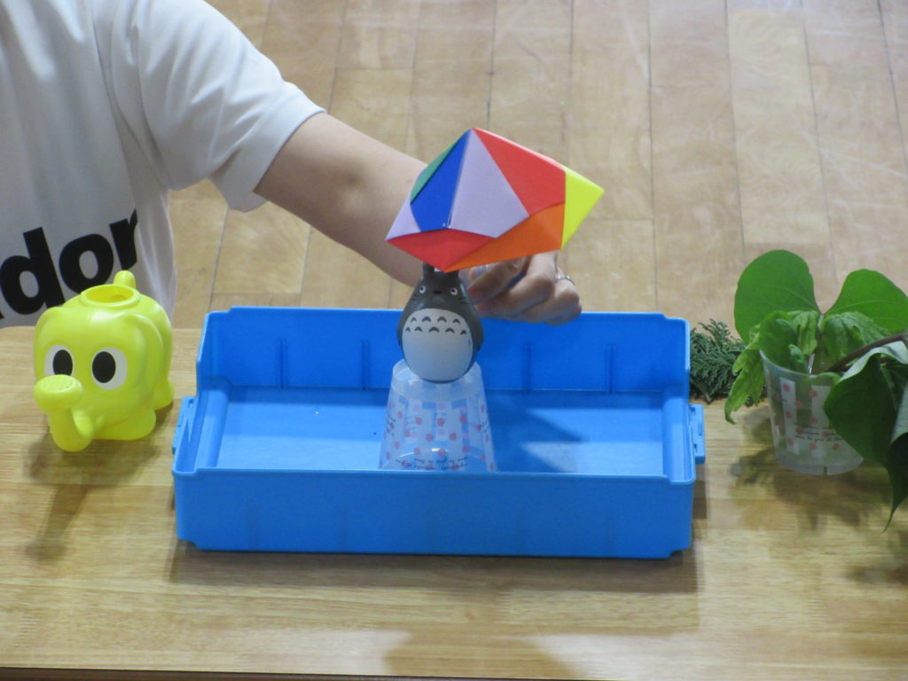 トトロさんが登場👀折り紙でできたカラフル傘をかぶっています☔