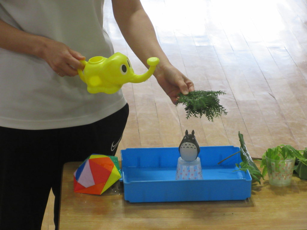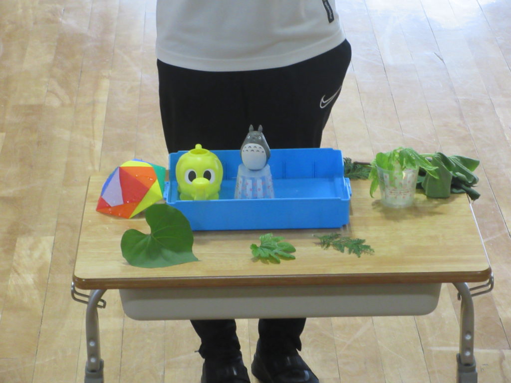 子どもたちの予想は、1番大きいアサガオの葉っぱだと濡れない です❕