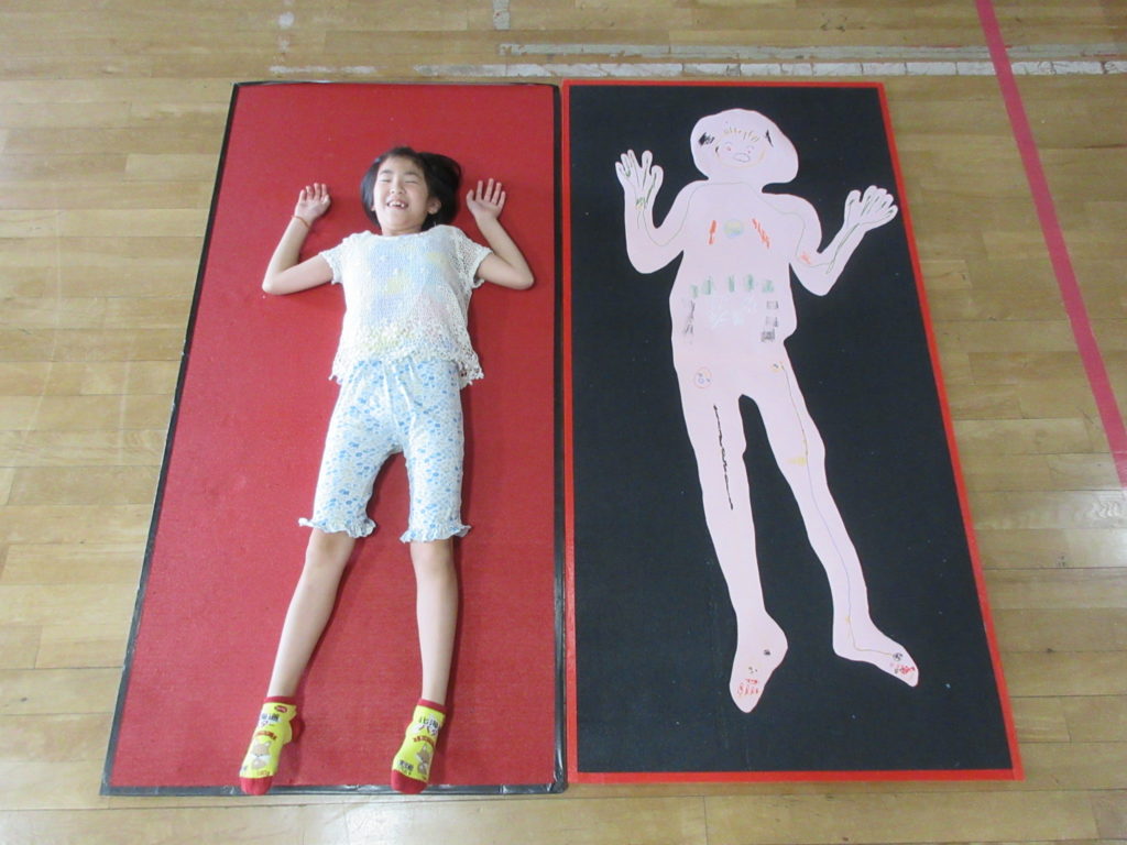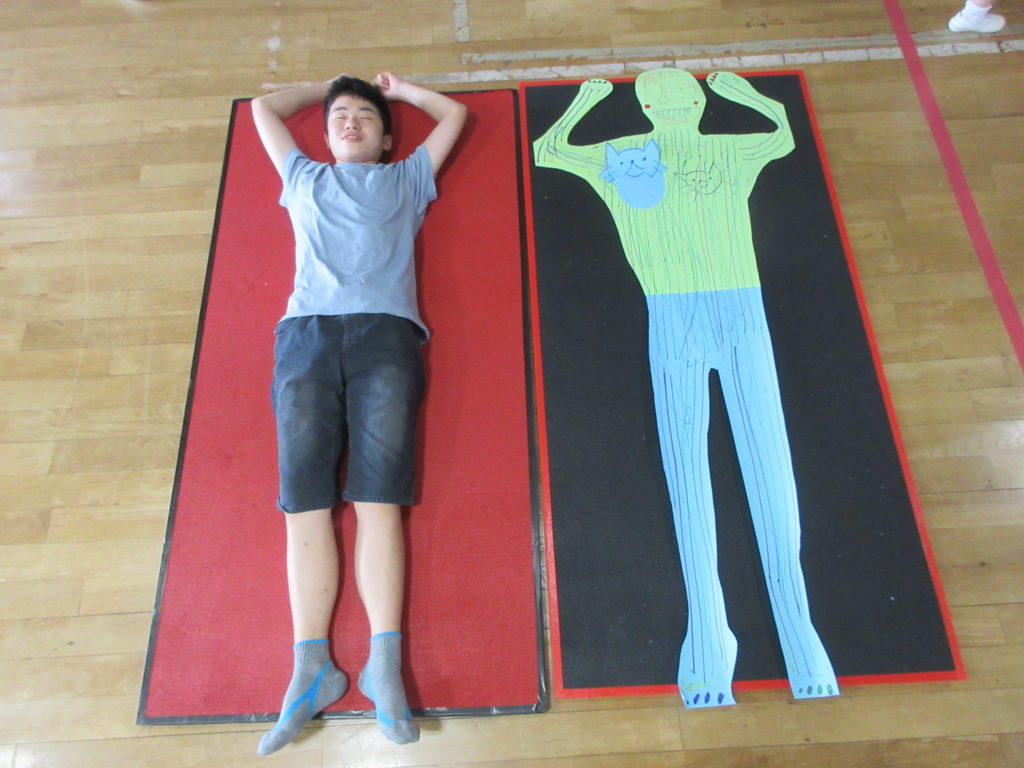 まずは画用紙に寝転がって自分の型をとります👀