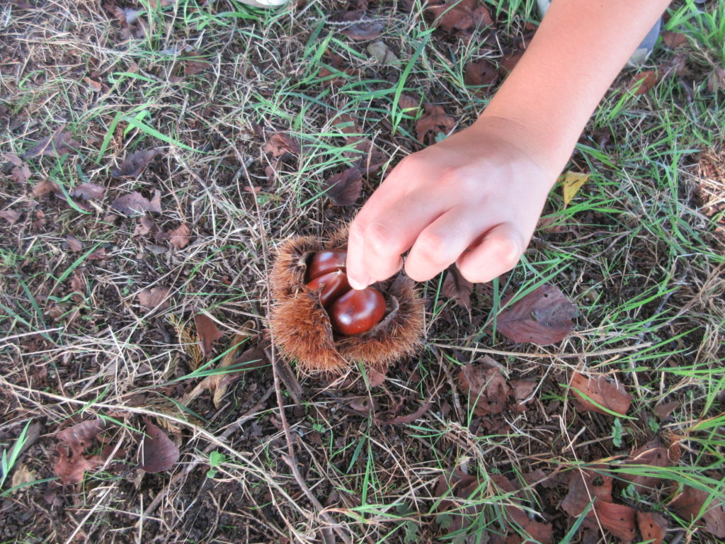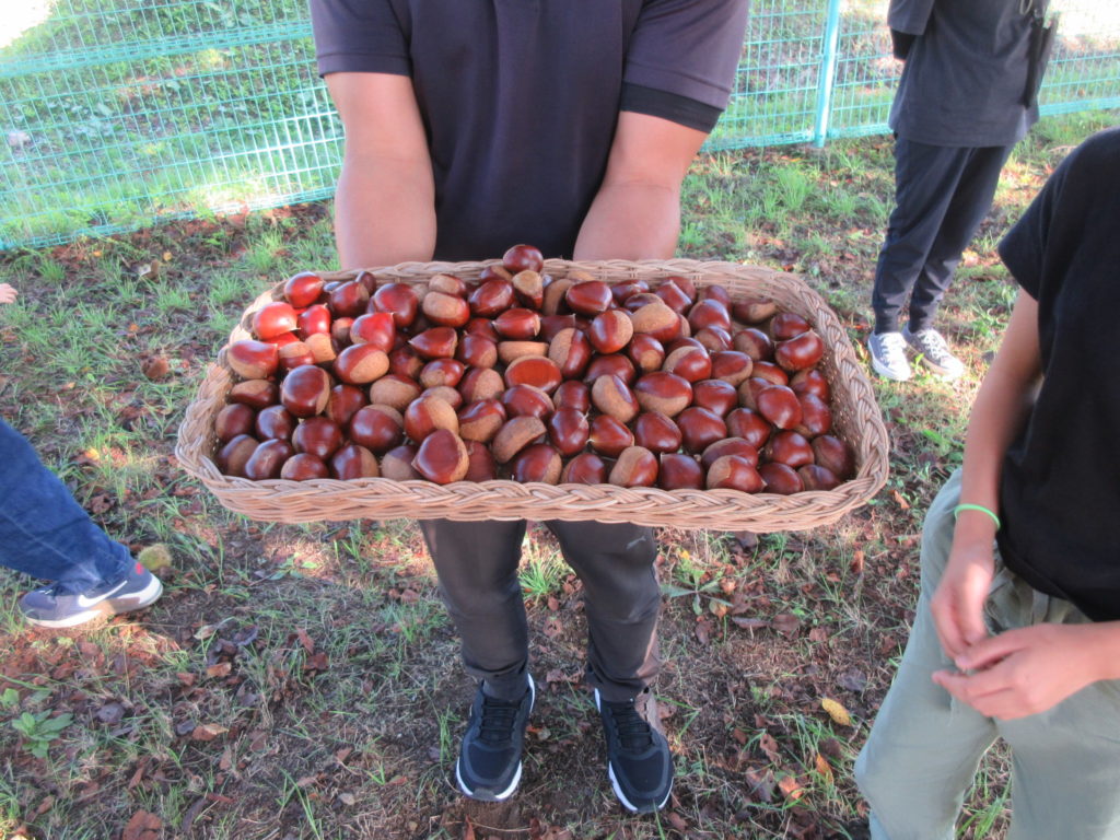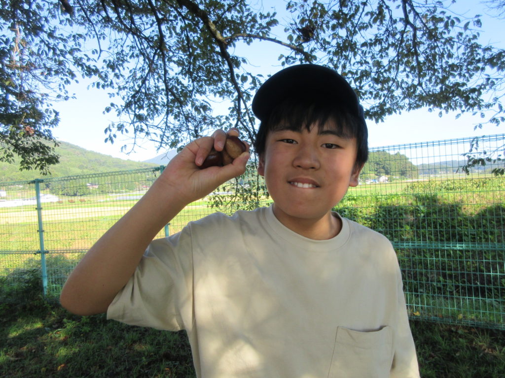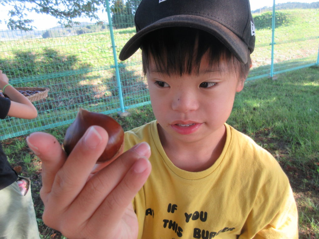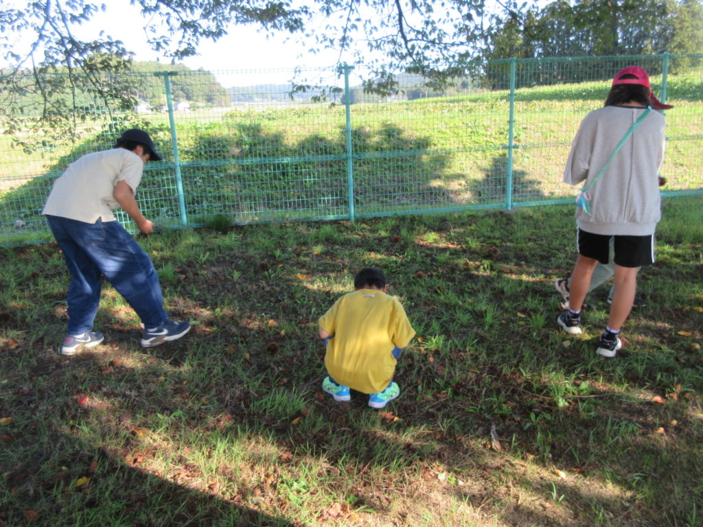 2025年10月3日(金) 栗拾い🌰 今日はみんなで栗拾いをしました😎 いがに包まれている栗が園庭にあるので、探しにいこう💪 見つけたら靴で左右に広げて、中の栗を拾います🌰 いがに指がささらないように注意です👆 たっぷり拾って大収穫でしたよ✨ みんなのお家におすそ分けしたので、おいしく食べてくれると嬉しいな😋