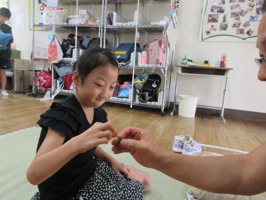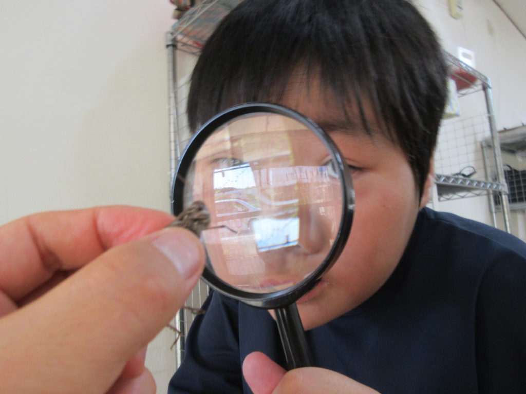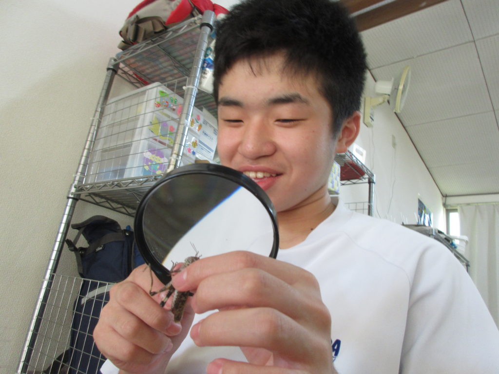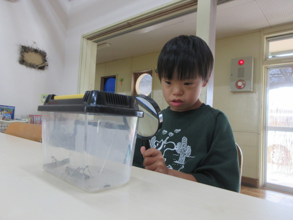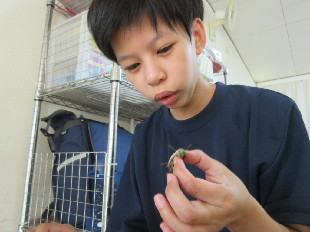 2025年8月21日(木) 観察🔍 今日の活動は『バッタの観察』をしてみました👀 虫メガネやバグキャッチャーを使ってじっくり観察しましたよ~👏 触るのが平気な子は、つんつん触ってみたり手で持ってみたり👀 普段はなかなか見ることができないお腹の部分も観察できました😊 毎日暑い日が続いていますね💦 熱中症にならないように気を付けて過ごしていきましょう🔥